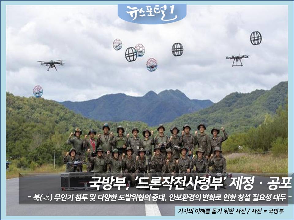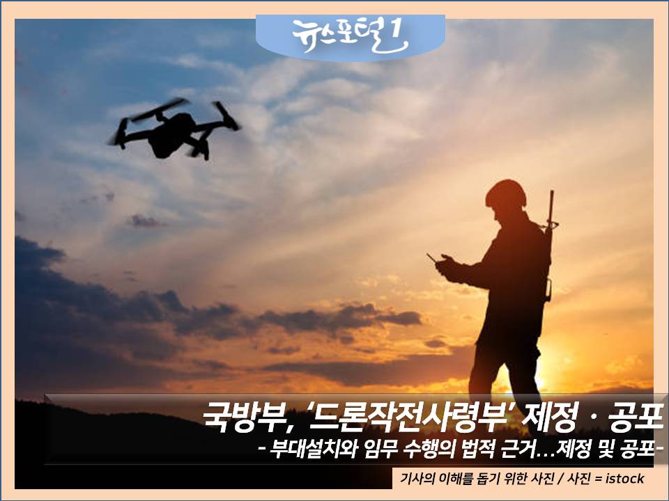 [한국시민기자협회 뉴스포털 1 = 최동욱 기자] 국방부는 북(北) 무인기 침투 및 다양한 도발위협의 증대, 현대·미래전의 드론 무기체계 활용 확대 등 안보환경의 변화로 드론작전사령부 창설 필요성이 대두됨에 따라, 부대 설치와 임무 수행의 법적 근거인 「드론작전사령부령」를 6월 27일부로 제정·공포한다고 밝혔다.