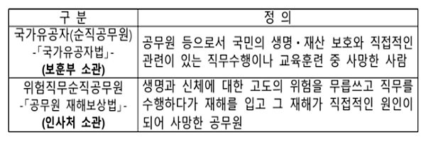 현재 위험직무순직 공무원과 국가유공자는 각각 별도의 법에서 규율하고 있어 요건 및 심의 내용이 유사함에도 유족들이 국가보훈부와 인사처 양 기관에서 별도의 인정 절차를 거쳐야 한다.