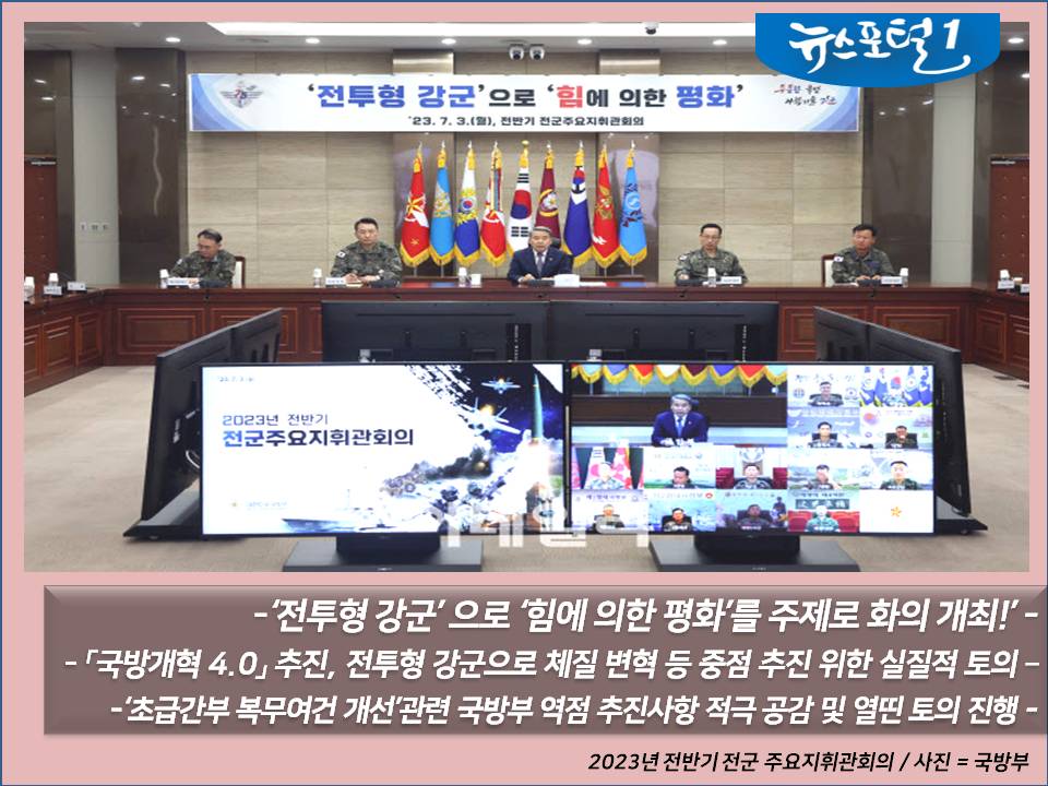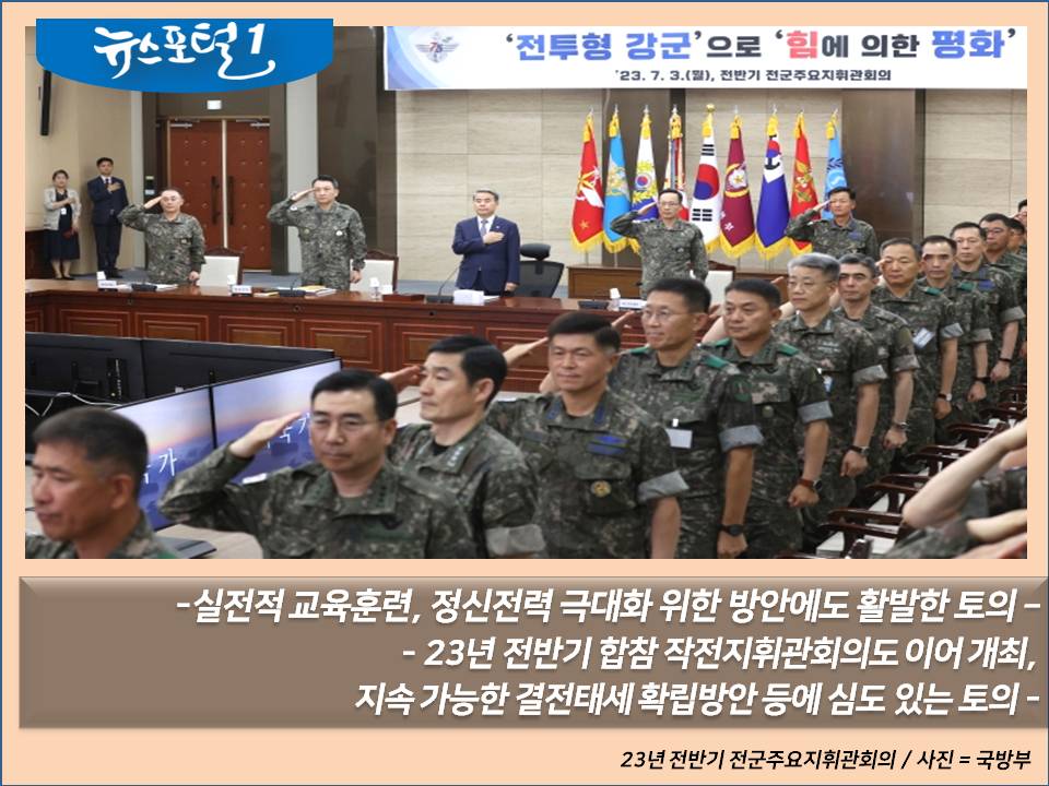 [한국시민기자협회 뉴스포털1=최동욱 기자] 국방부는 7월 3일(월) 이종섭 국방부장관 주관으로 「2023년 전반기 전군주요지휘관회의」를 개최하였다.