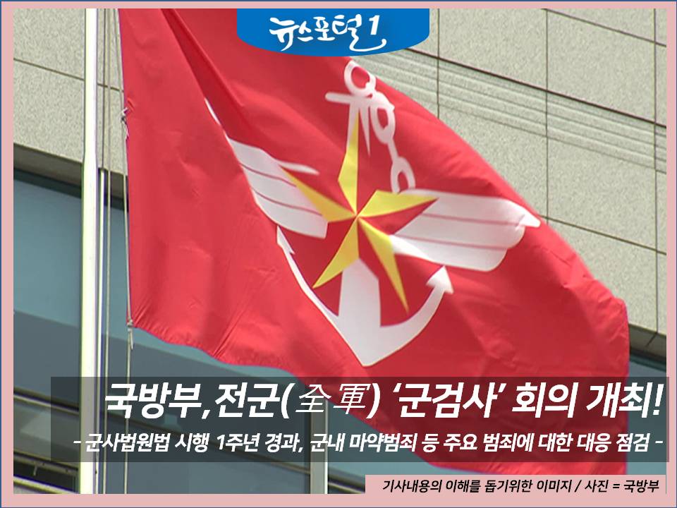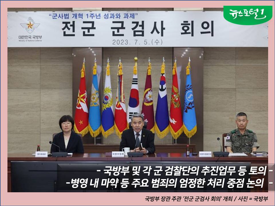 [한국시민기자협회 뉴스포털1=최동욱 기자] 제10기 국방부는 7월 5일(수) 개정 「군사법원법」 시행 1주년 경과 및 군내 마약범죄 등 주요 범죄에 대한 대응을 점검하고 향후 발전과제를 논의하기 위한 전군 군검사 회의를 국방부 대회의실에서 개최하였다.