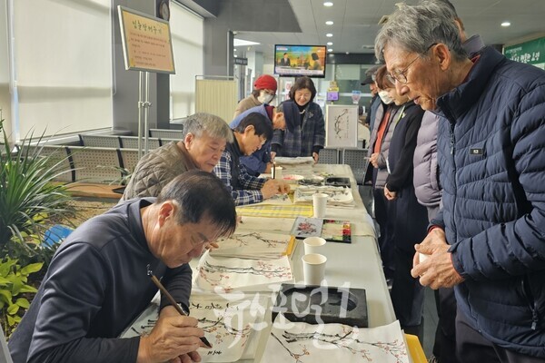 효령타운 문인화반 회원들이 재능기부로 참여해 이용회원을 대상으로 문인화 그림을 배경으로 ‘입춘대길(立春大吉)’과 ‘건양다경(建陽多慶)’ 등 글귀를 써줬다.