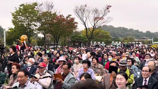 효령노인복지타운 노인의 날 기념 ‘꿈꾸는 노년, 언제나 청춘’ 행사에서 강기정 광주시장 부인 유귀숙 여사가 축사를 하면서 \"한강 작가는 태어났다. 대한민국 광주에서\"라는 강 시장의 자랑을 전하고 있다.