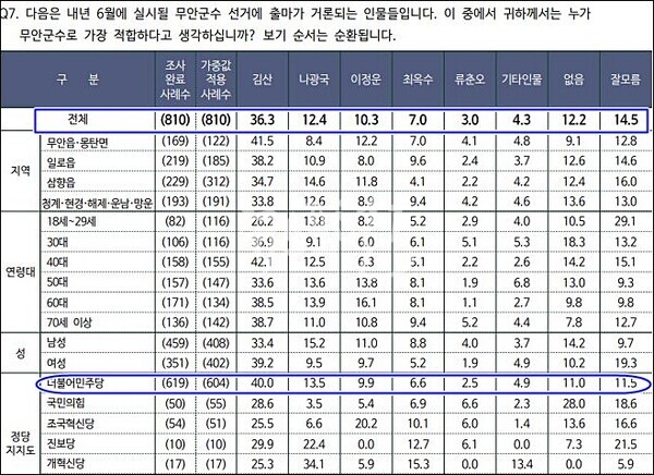 더불어민주당 지지층에서도 역시 김산 무안군수가 40.0%를 기록하며 2위 나광국 도의원(13.5%)에 약 3배 정도 앞서며 1위를 차지했고, 3위 이정운( 9.9%), 4위 최옥수(6.6%), 5위 류춘오(2.5%)순으로 나타났다.