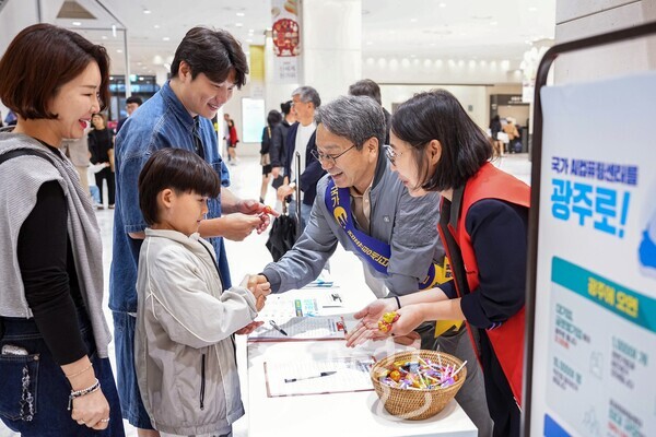 [한국시민기자협회=기범석 기자] 강기정 광주광역시장이 3일 오후 서구 유스퀘어 종합버스터미널과 광주 신세계백화점에서 추석 인사를 하며 국가AI컴퓨팅센터 유치 캠페인을 벌였다.