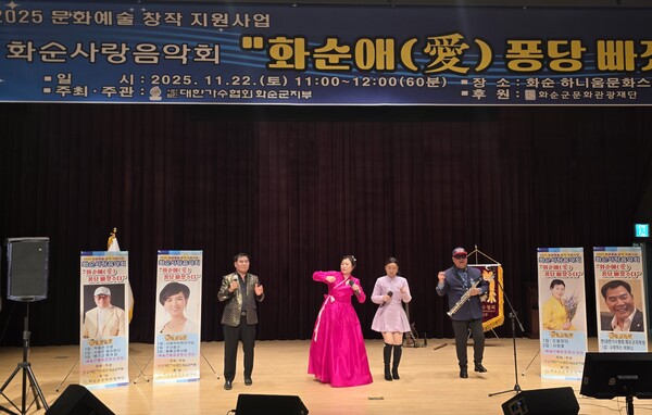 화순군문화관광재단의 창작활동 지원으로 이뤄진 이날 음악회는 ‘화순愛 퐁당 빠졌수다’를 주제로 김기석 회장과 김미연, 빛나라, 한길로 등 4명의 가수가 무대를 꾸몄다.