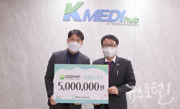 12월 22일 대구경북첨단의료산업진흥재단 이사장 회의실에서 후원금 전달식이 진행됐으며 양진영 케이메디허브 이사장과 이상태 보아스사회공헌재단 이사장 및 관계자들이 이날 자리하였다.